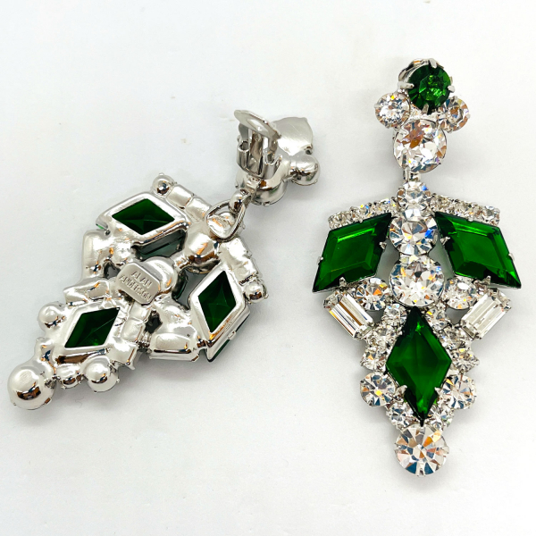 Bold and Dramatic Jet, Clear and “Flawed” Emerald Vintage Austrian Crystal Pendant Drop Earrings featuring Large Austrian “Flawed” Emerald Cushion Cut Stones