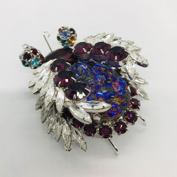 Dimensional and Whimsical Multi Purple and Clear Crystal Swarovski Bug Brooch featuring a Textured, Iridescent Art Glass Oval Stone