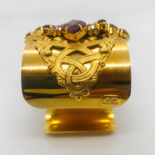 Dramatic Byzantine Style Smoked Topaz and Amethyst Austrian Crystal Open Bangle Cuff Bracelet